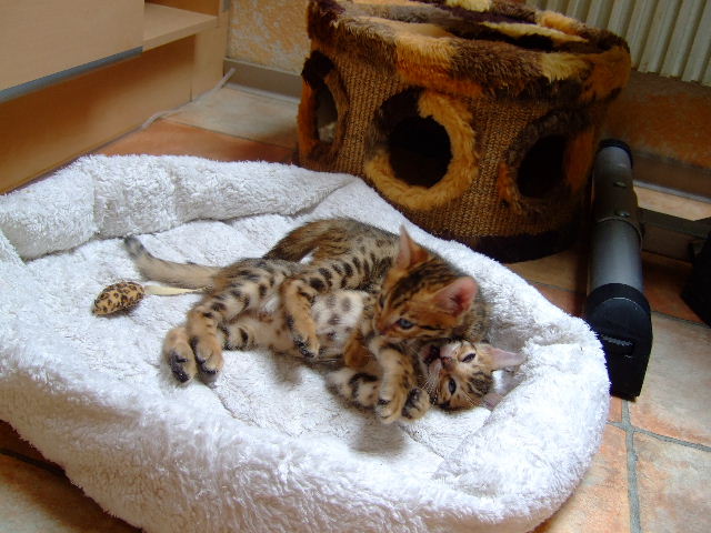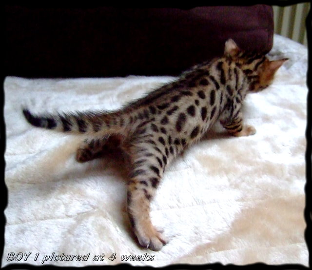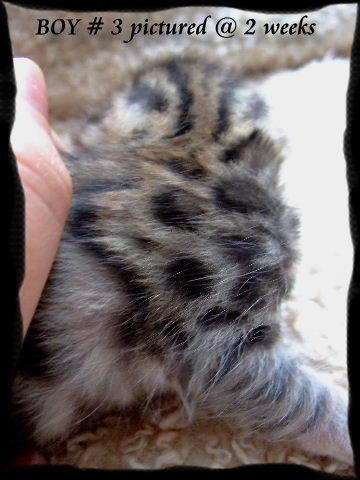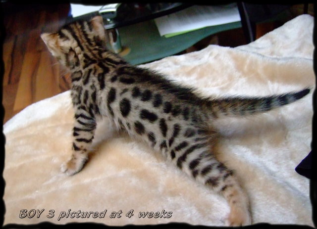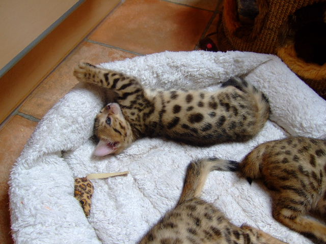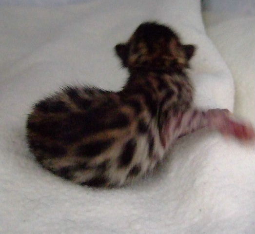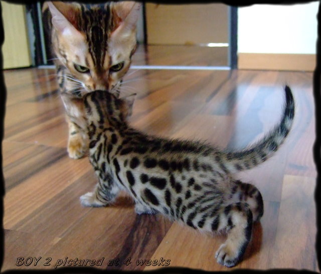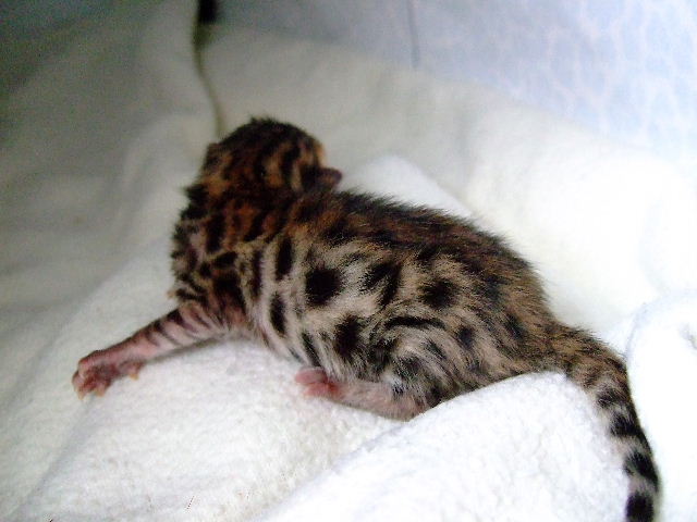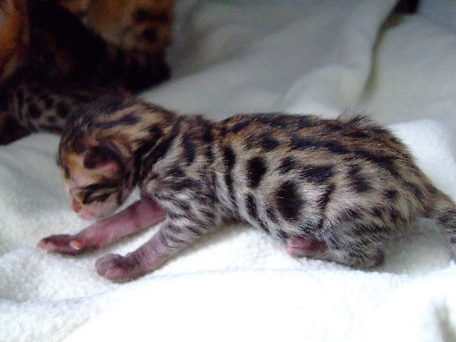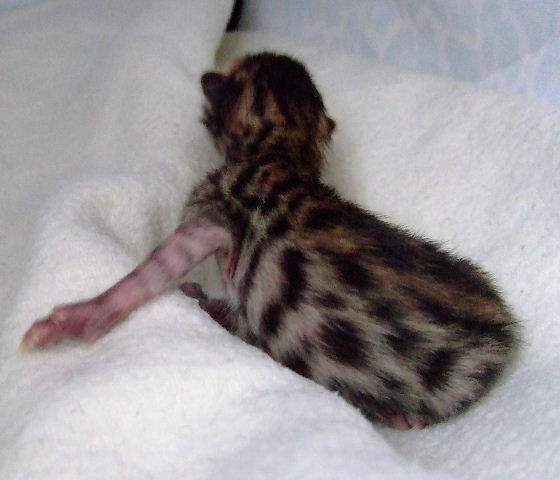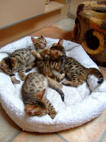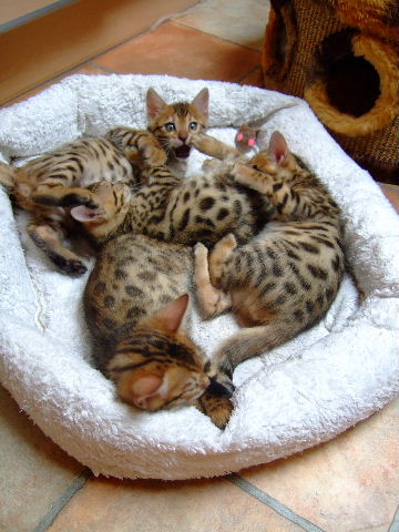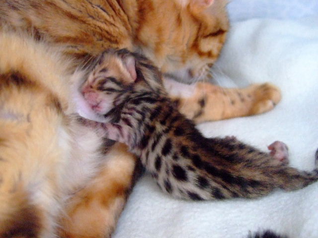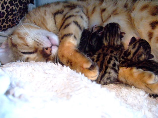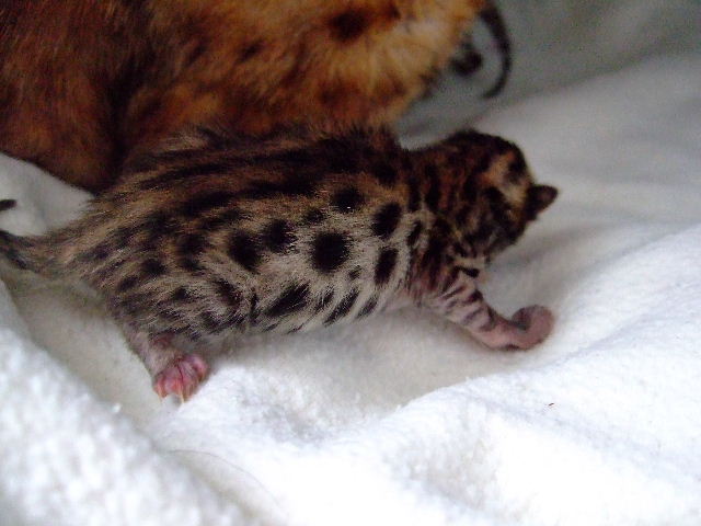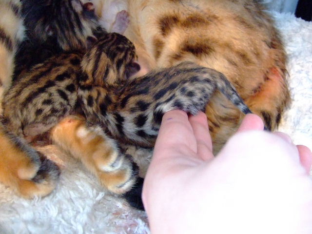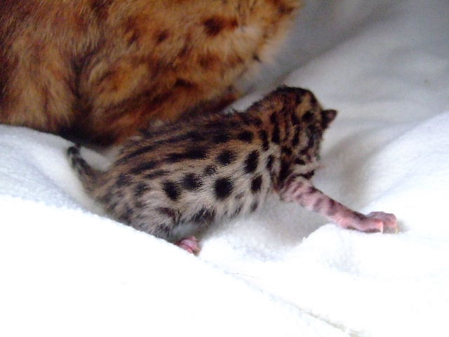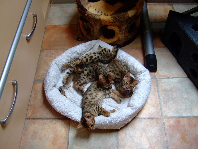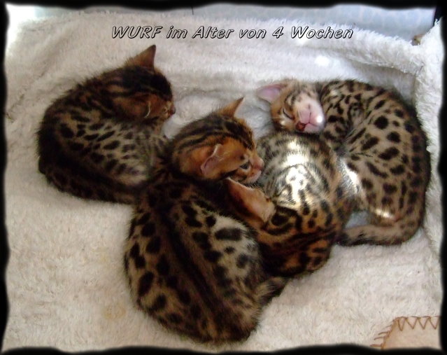 In der Nacht vom 03.05 auf den 04.05 hat unsere Special ihren 1. Wurf geboren. Es sind 3 Katerchen und 1 Mädchen, alle black-spotted-tabby ( sie werden alle eine wunderbare Rosettenzeichnung bekommen). Wir sind sehr glücklich, dass unsere Special & Xtreme uns einen solch traumhaften Wurf geschenkt haben und das alle Kitten gesund und munter sind :o)