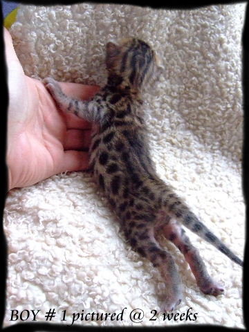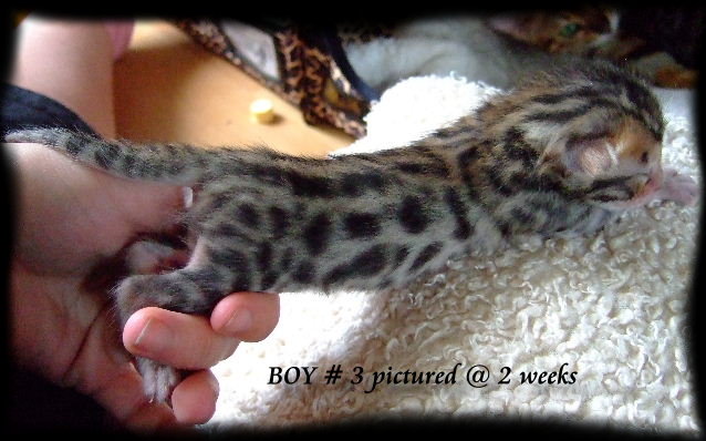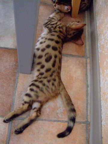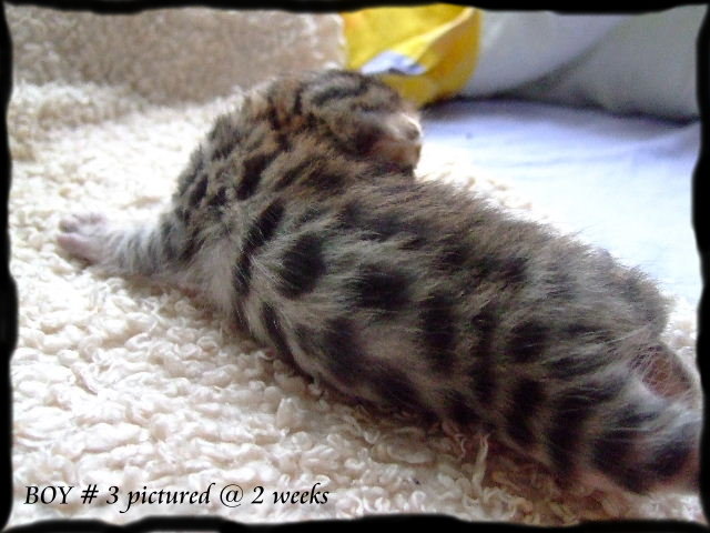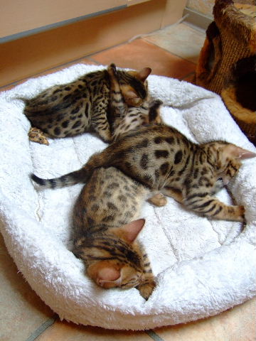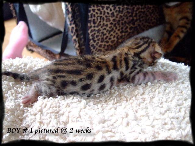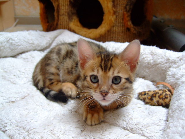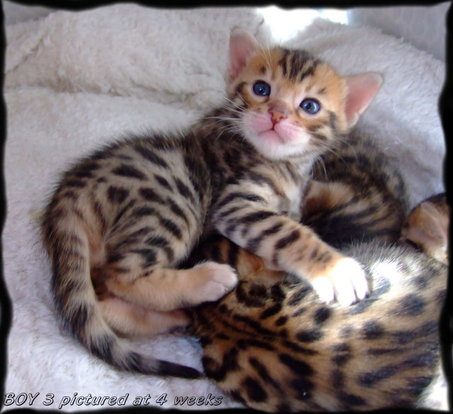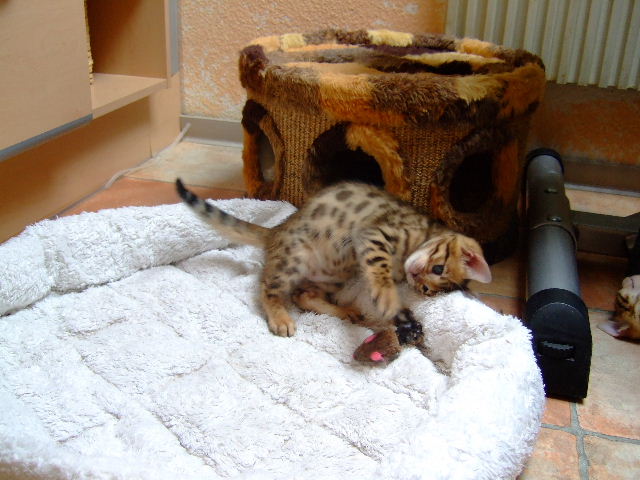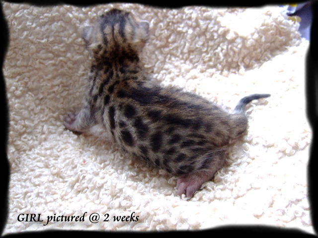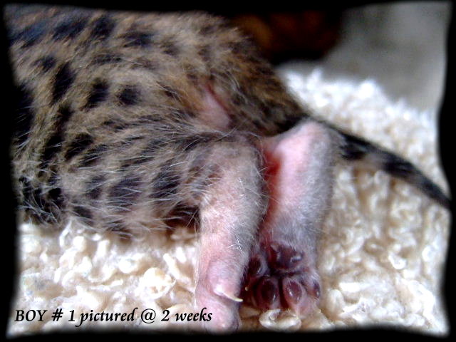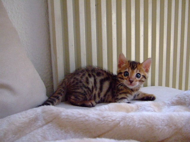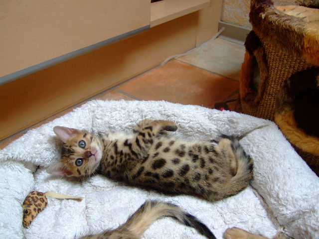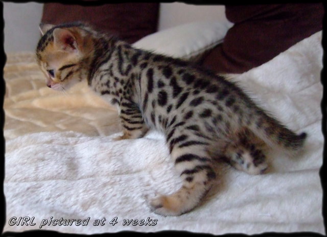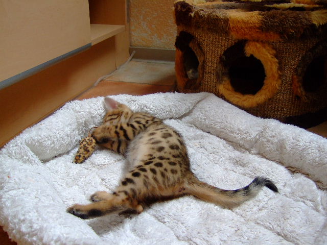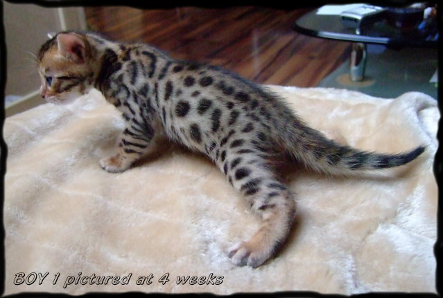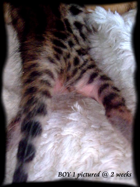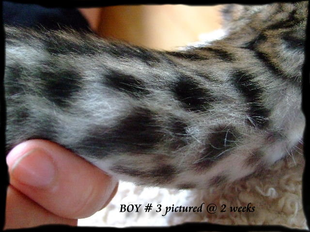 In der Nacht vom 03.05 auf den 04.05 hat unsere Special ihren 1. Wurf geboren. Es sind 3 Katerchen und 1 Mädchen, alle black-spotted-tabby ( sie werden alle eine wunderbare Rosettenzeichnung bekommen). Wir sind sehr glücklich, dass unsere Special & Xtreme uns einen solch traumhaften Wurf geschenkt haben und das alle Kitten gesund und munter sind :o)