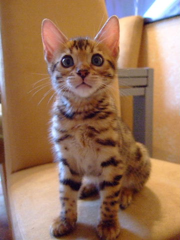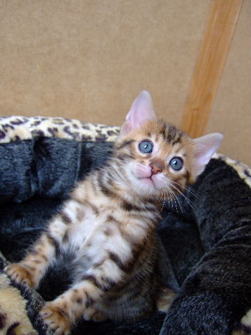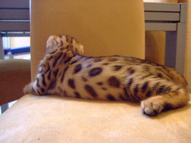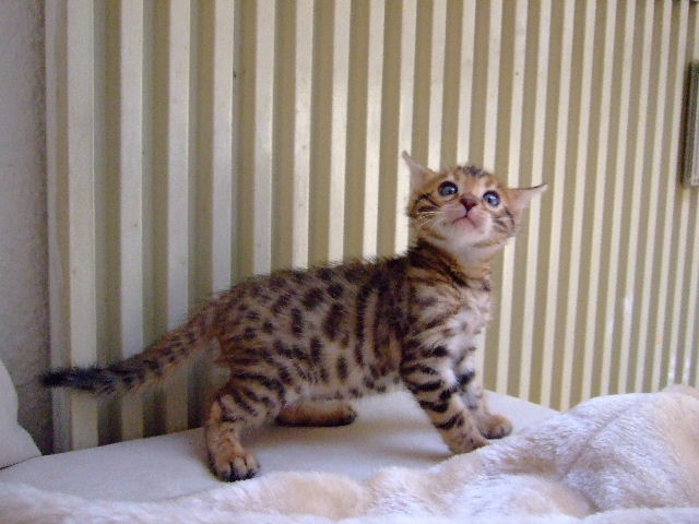 * sehr schön angeordnete Zeichnung * extremer Kontrast von seiner hellen Grundfarbe zu seinen pechschwarzen Spots * auch er bekommt Rosetten * sehr tolle doppelte Schulterzeichnung * sehr hübscher Gesichtsausdruck mit dicken Schnurrhaarkissen, breiter Nase, heller Augenumrandung, großen Augen, kein Tabby-M * sehr toll gezeichneter Bauch im "Zipper-Design" * extrem klares, seidenweiches und kurzes Fell * golden Glitter