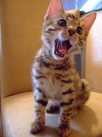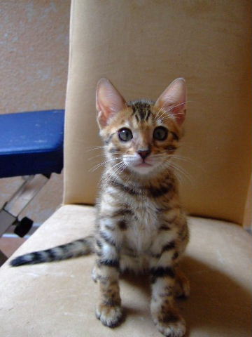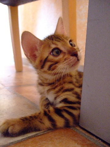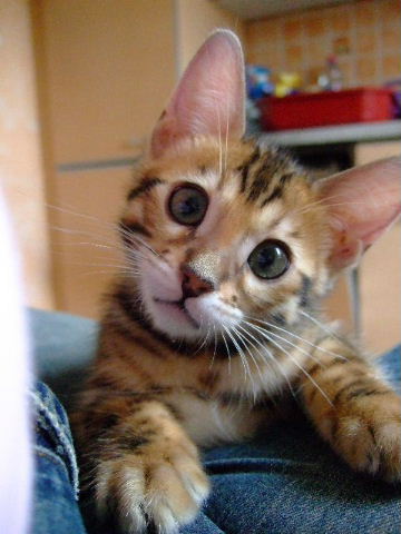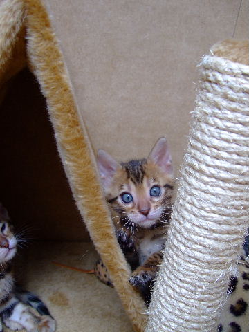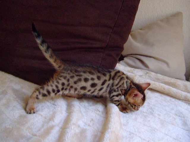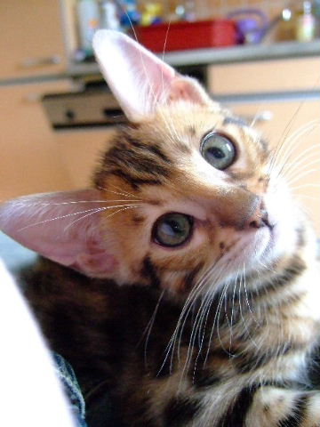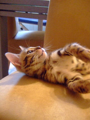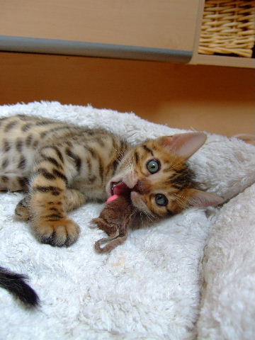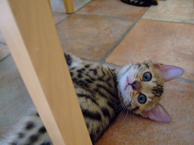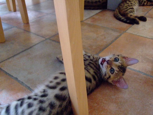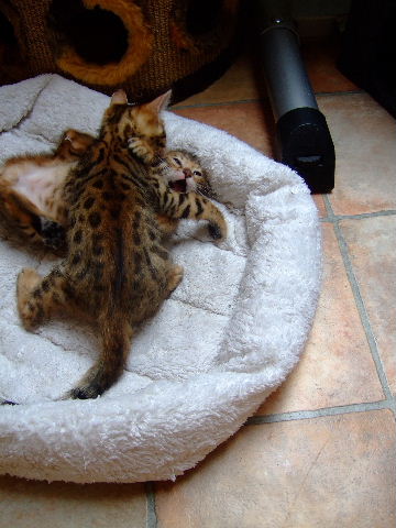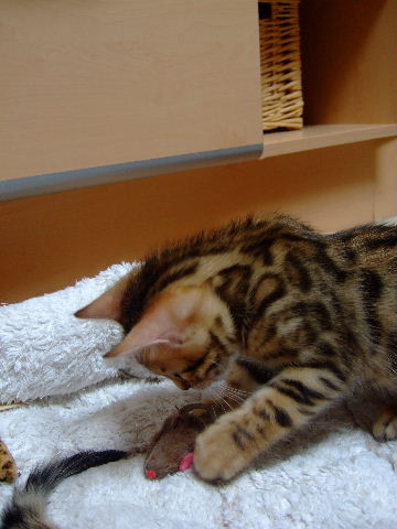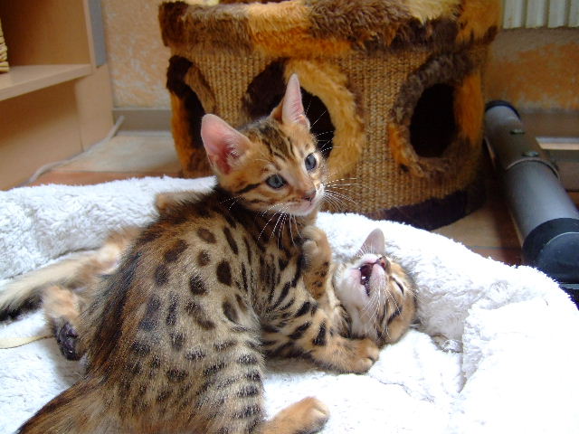Unsere Süßen sind jetzt 6 Wochen jung und es gibt nichts, was nicht in irgendeiner Weise interessant für sie ist :o) Die Kitten sind nun mitten in der "Fuzzyphase" - daher sieht ihre Zeichnung momentan nicht so kontrastreich aus wie zuvor ( mehr Infos hierüber finden Sie auf unserer Seite "Kauftipps" - ganz unten ). Alle Kitten fressen sowohl Nass-, als auch Trockenfutter und sind stubenrein. Die Lieblingsbeschäftigung ist momentan mit dickem Schwänzchen (die optisch einem explodierten Tannenzapfen gleichen) rum zu rennen um Eindruck zu schinden und andere zu erschrecken :o)