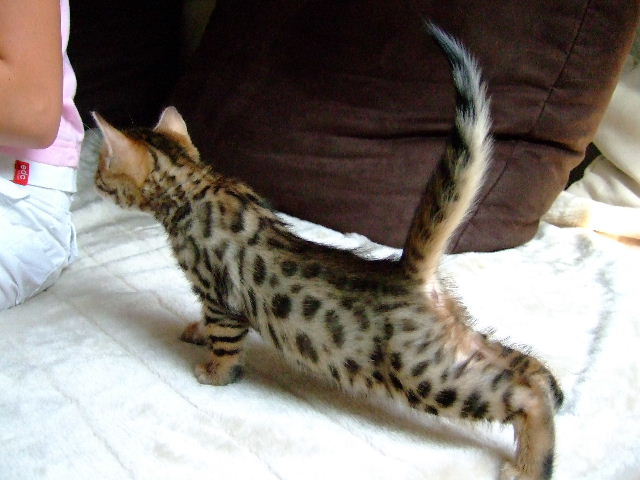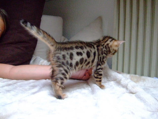 * Äußerst gleichmäßige Zeichnung auf beiden Seiten * keine Streifen * gepunktete Hinterbeine * oberes Drittel vom Schwanz gepunktet * sehr schöne DICKE Spots, die sich zu Rosetten öffnen * extremer Kontrast * schöne doppelte Schulterzeichnung * kurzes und seidenweiches Fell * golden Glitter * sehr ausdrucksvolles Gesicht mit dicken Schnurrhaarkissen, breiter Nase, gut gesetzten Ohren, kein Tabby-M *