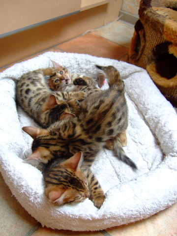 Unsere Süßen sind jetzt 4 Wochen jung und in den großen Laufstall (ins Wohnzimmer) gezogen. Dort wird jetzt schon richtig getobt und ausgiebig gespielt :o) Laufen können unsere Racker jetzt sehr gut und es geht schon flott voran - auch erste Kletterversuche am kleinen Kratzbaum werden unternommen. Die Rosetten aller Kitten beginnen sich nun zu öffnen. Die Kitten beginnen nun auch alle mit der "Fuzzyphase" ( mehr Infos hierüber finden Sie auf unserer Seite "Kauftipps" - ganz unten ). Milch gemischt mit etwas Nassfutter können sie nun schon schlecken und es ist eine willkommene Abwechslung, aber Mamis Milchbar wird natürlich weiterhin bevorzugt :o)