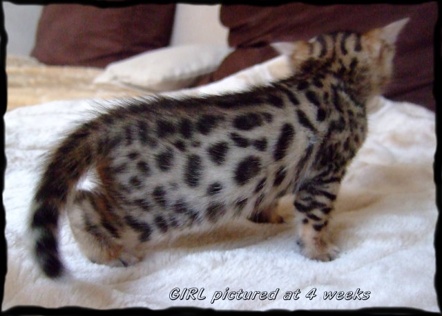 * Äußerst gleichmäßige Zeichnung auf beiden Seiten * keine Streifen * "Riesenrosetten" (beginnen sich zu öffnen) * extremer Kontrast / helle Grundfarbe zu schwarzen Rosetten * kurzes und seidenweiches Fell * clear-coated * golden Glitter * doppelte Schulterzeichnung * Rosetten auf den Schultern * außerordentlich hübsches Gesicht mit dicken Schnurrhaarkissen, breiter Nase, sehr hell umrandeten Augen, kein Tabby-M, gut gesetzte Ohren *